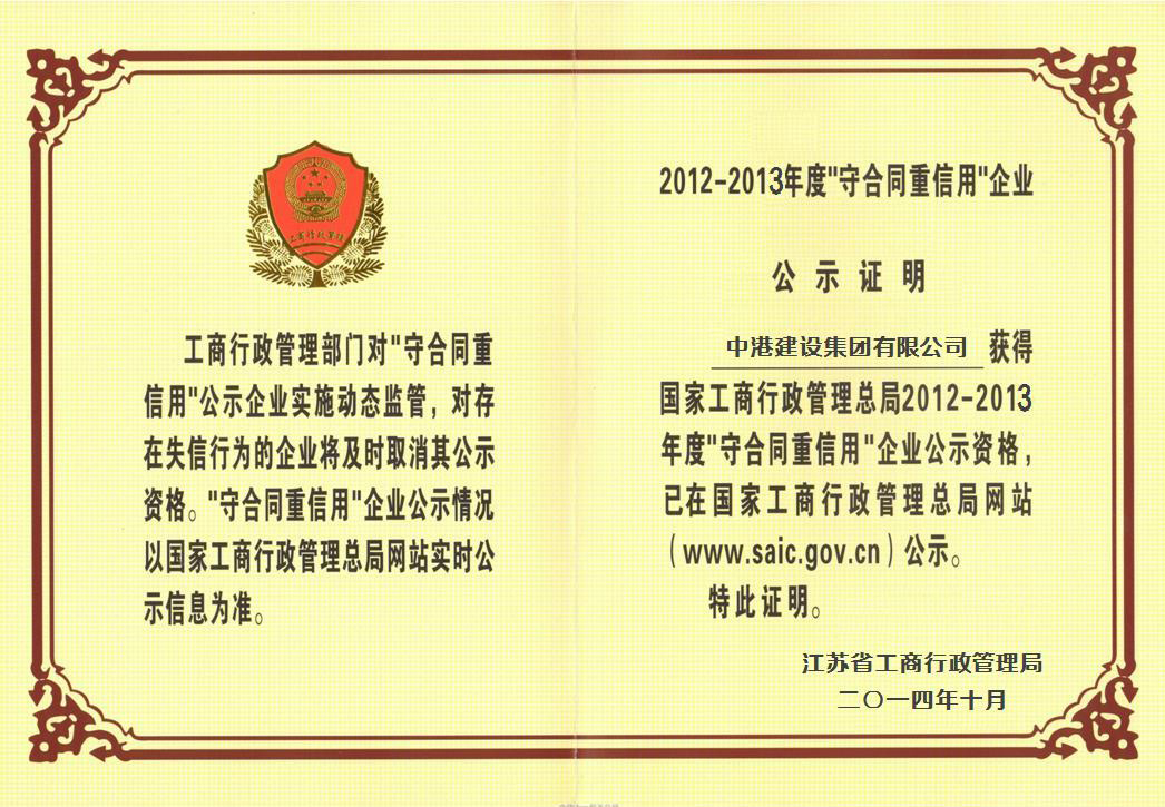 中港建設(shè)集團(tuán)榮獲國(guó)家工商總局 “守合同重信用”企業(yè)榮譽(yù)稱(chēng)號(hào)